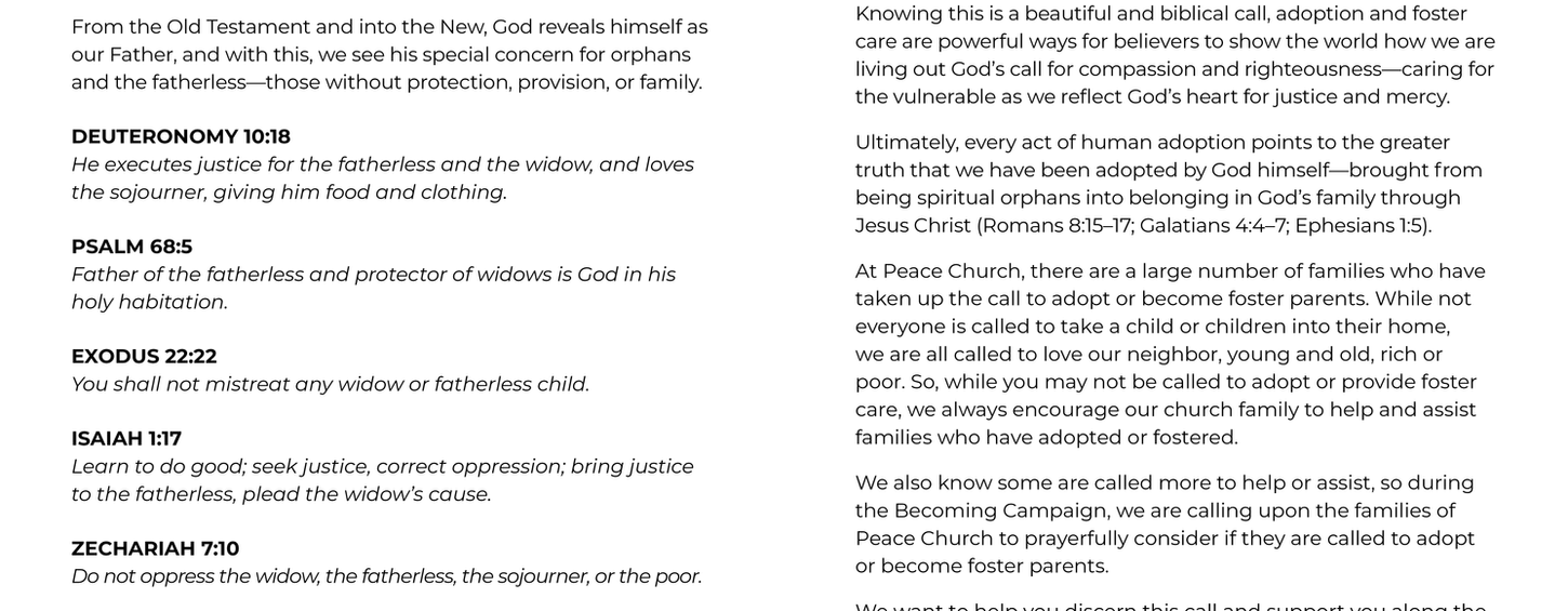 We also know some are called more to help or assist, so during the Becoming Campaign, we are calling upon the families of Peace Church to prayerfully consider if they are called to adopt or become foster parents.